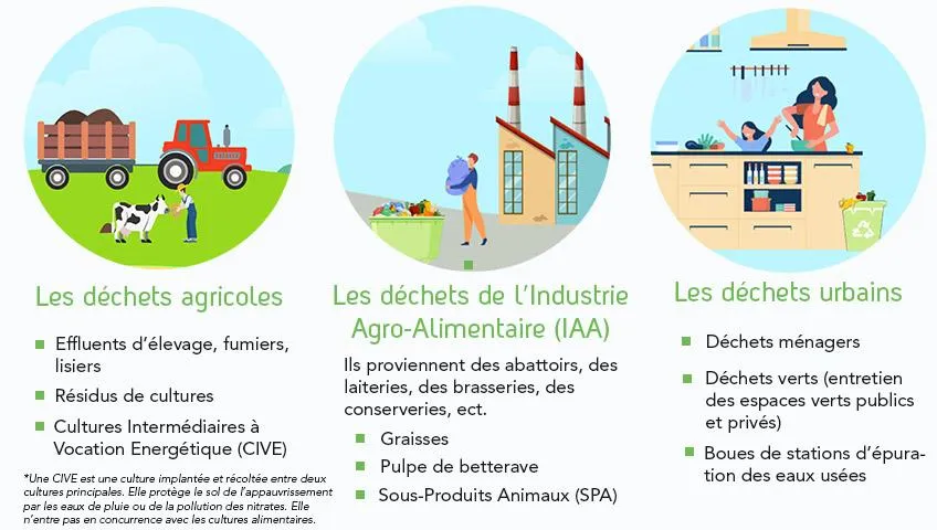 - Les déchets agricoles (fumiers, lisiers, résidus de cultures, Cultures Intermédiaires à Vocation Energétique appelées CIVE) ;