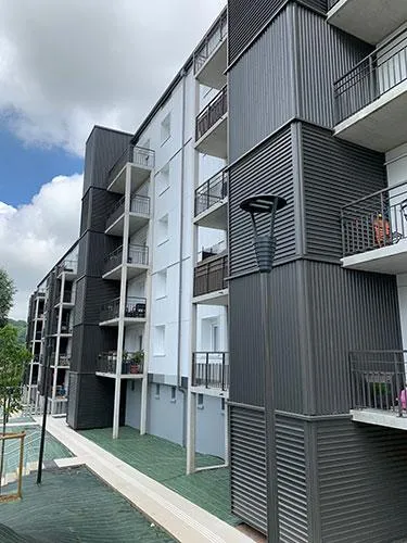 Rénovation intérieure intégrale de l’ensemble des 90 logements, isolation par l’extérieur renforcée, création d’ascenseurs et de bacons rapportés… Difficile de faire la différence avec une opération neuve, tant le volet architectural est réussi ! Les plus initiés aux techniques du chauffage constateront même que les « ventouses » qui extraient les fumées des chaudières sont de deux couleurs, assorties aux teintes du bardage.